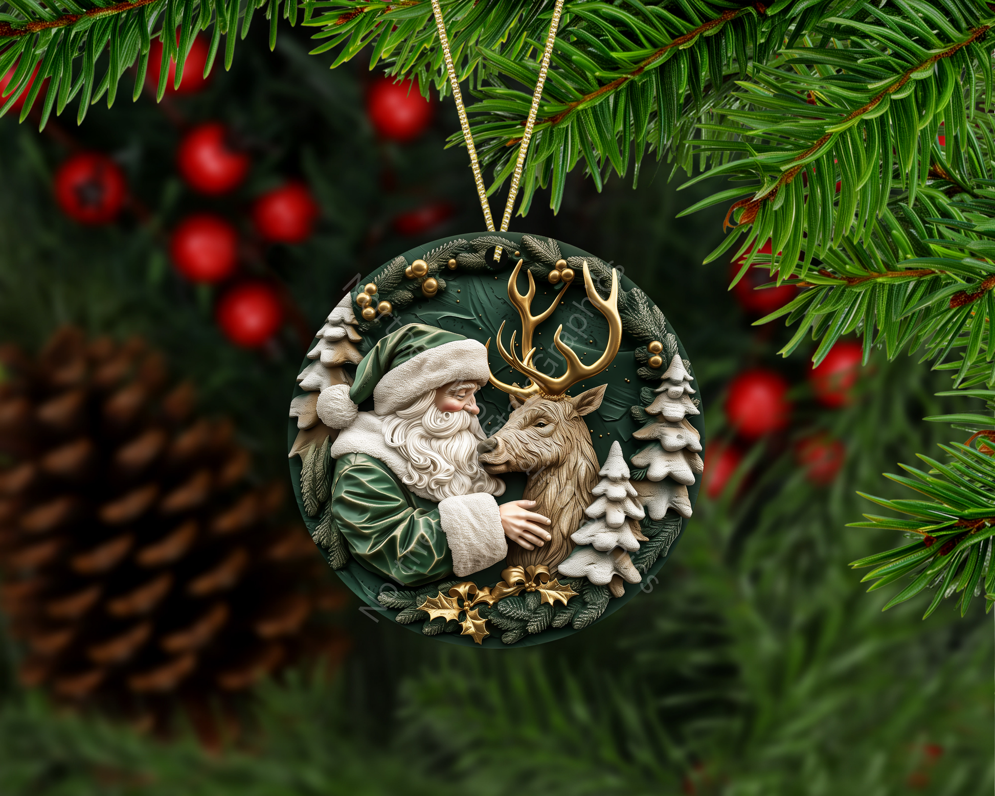 Forest Green Santa With Golden Reindeer Christmas Ornament