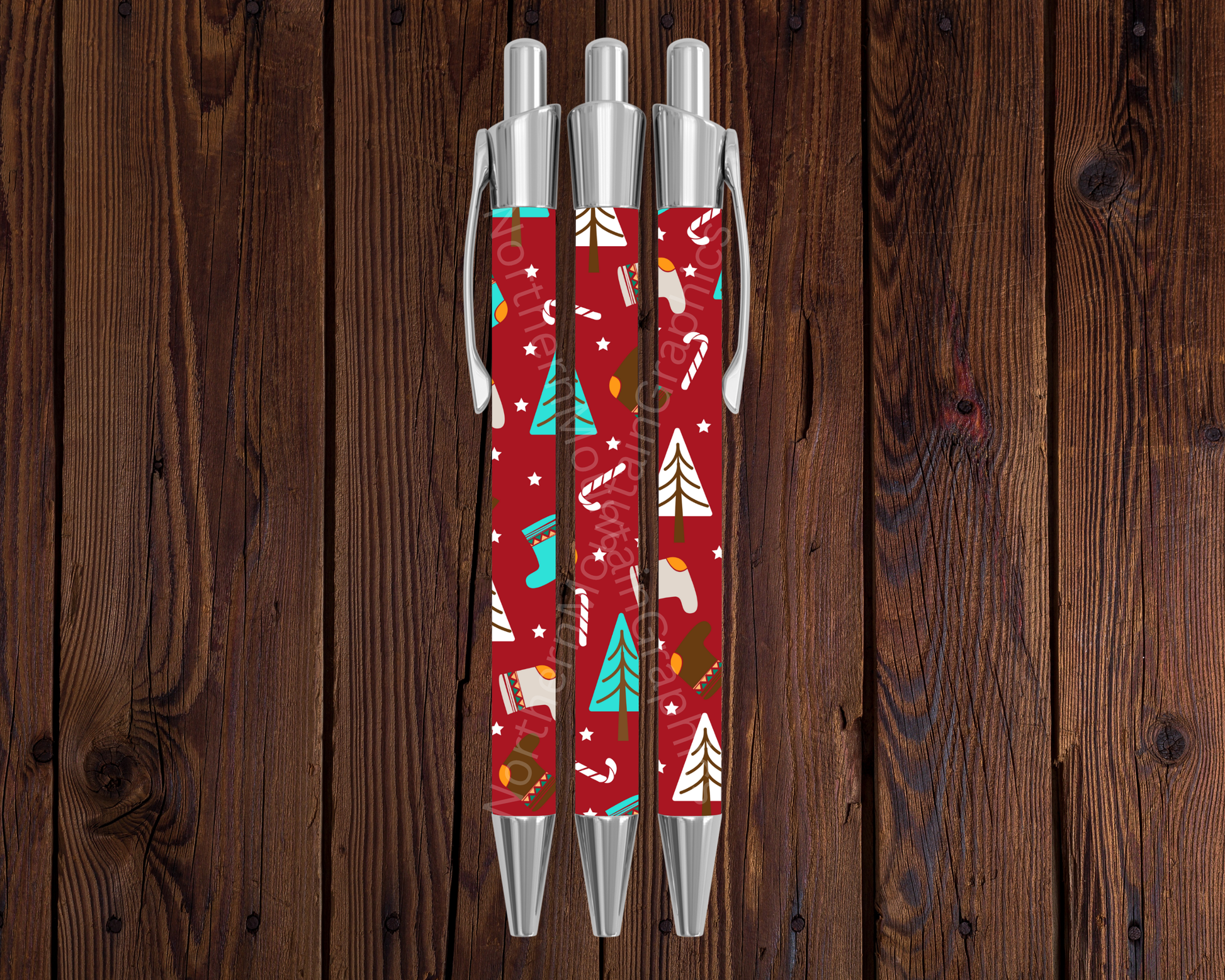 Mittens, Trees & Candy Canes on Red Christmas Pen